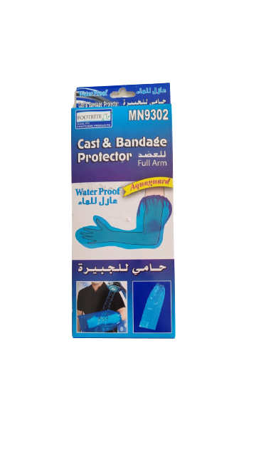 - حامي جبيرة عزل للماء للذراع MN9302 يتكون من غلاف بلاستيكي طويل محكم الإغلاق من احد الاطراف وقابل للتعديل بشريط مطاطي او شريط لاصق او اربطة على الطرف الآخر يحمي الجبيرة من الماء اثناء الاستحمام .